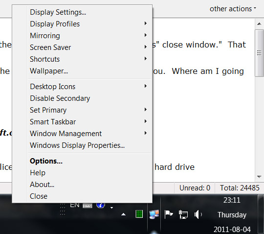 To configure settings, right-click the UltraMon icon in the system tray (the area of the main taskbar with the clock), this will bring up the main UltraMon menu.